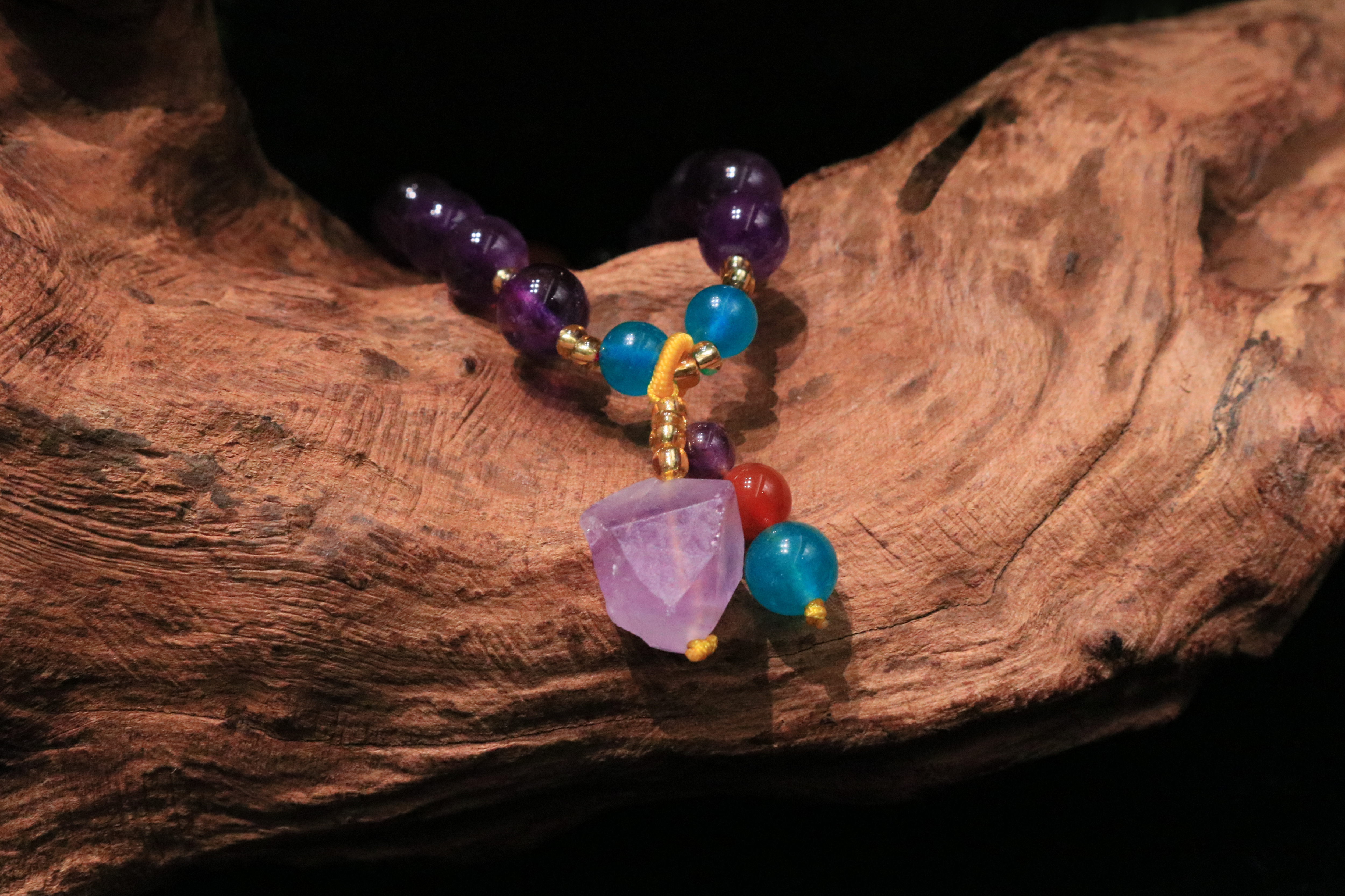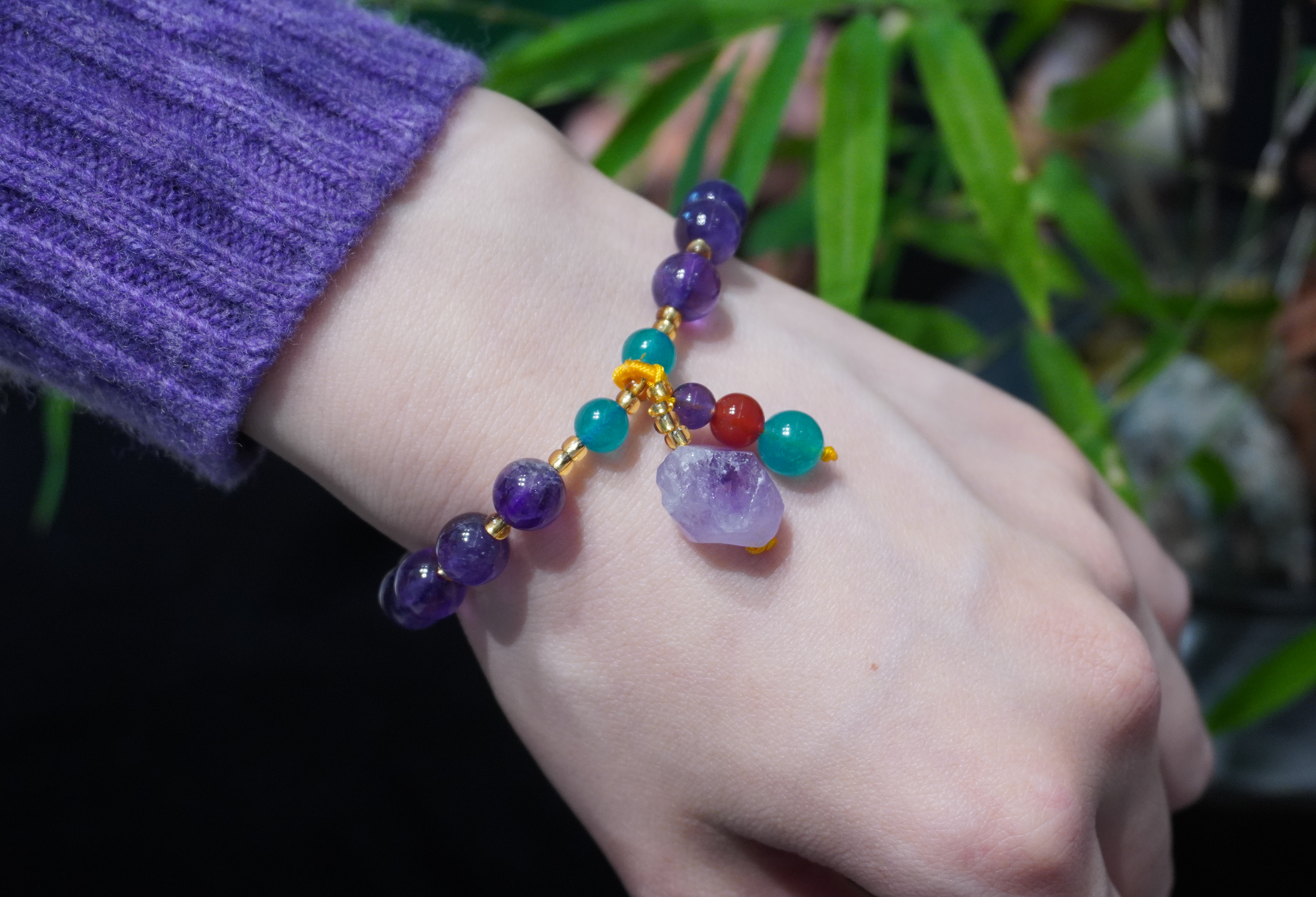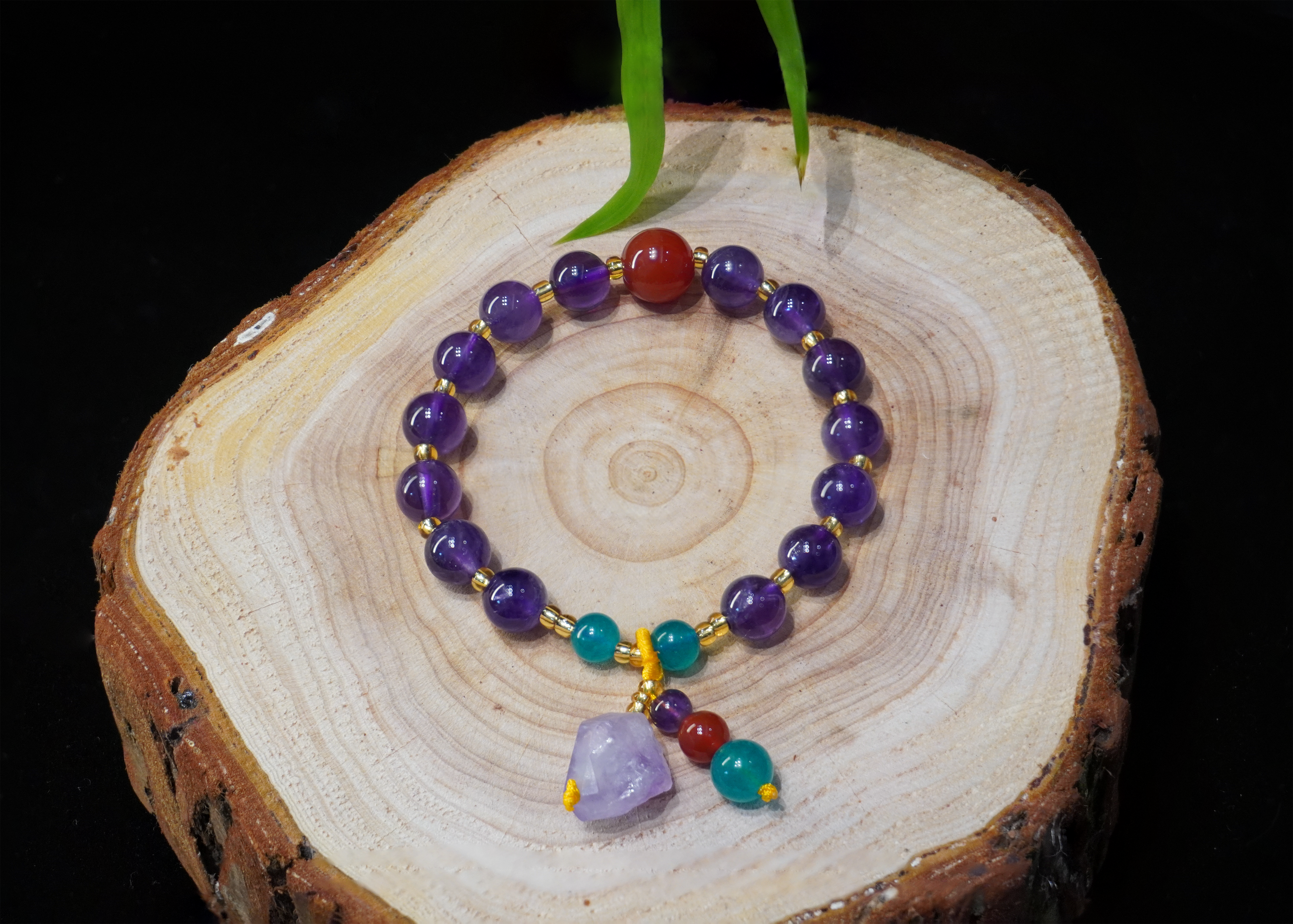 This Natural Lavender Amethyst Raw Crystal Bracelet features beautiful lavender amethyst beads, known for their calming and healing properties. The bracelet is adorned with a striking raw amethyst crystal, along with vibrant beads of turquoise, red agate, and gold accents, creating a harmonious and visually captivating piece.
