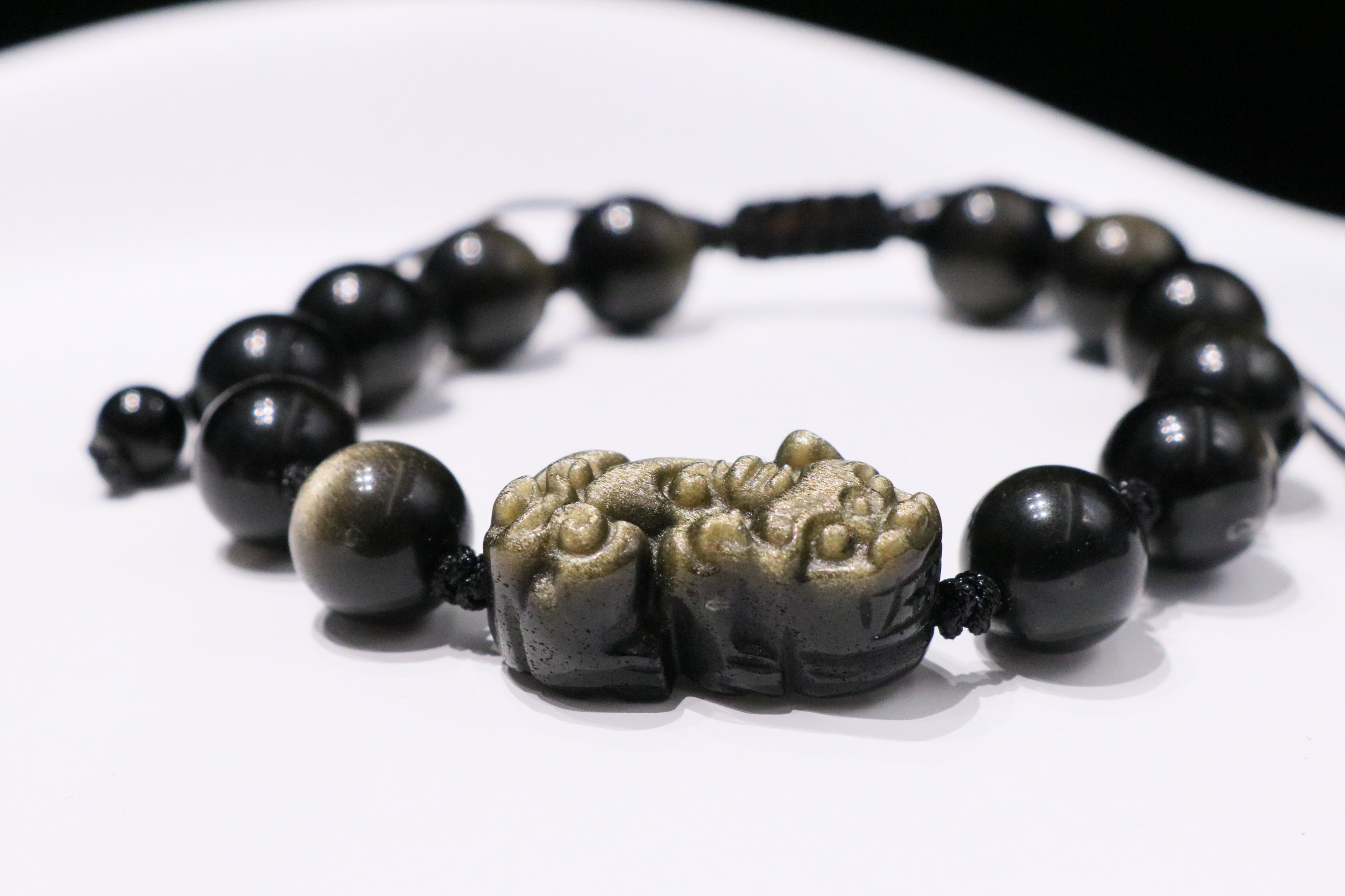 This exquisite Obsidian Bracelet features natural obsidian beads with a shimmering, deep black hue, paired with a bronze-colored Pi Xiu charm, adding a traditional cultural touch. Known as a powerful protective stone, Obsidian carries profound spiritual energy, helping to shield the wearer from negative emotions and external negative forces, promoting inner peace and clarity.
