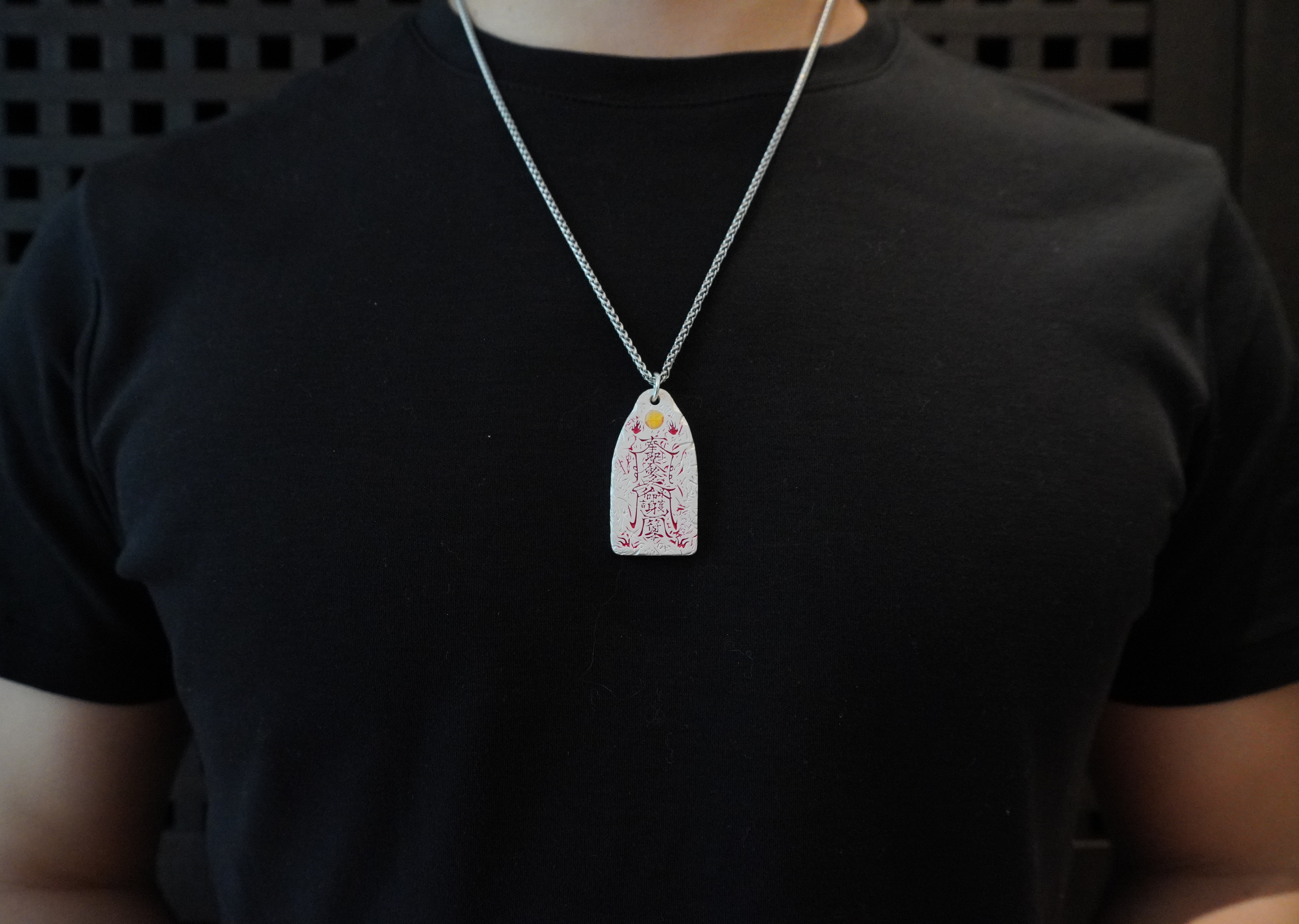 This necklace is a striking piece crafted from pure silver, featuring an intricately engraved pendant with traditional symbolic inscriptions. Accentuated with bold red markings, the design reflects a deep cultural heritage, often associated with protection and positive energy. A golden emblem at the top adds an extra touch of auspiciousness, making it a meaningful and stylish accessory.